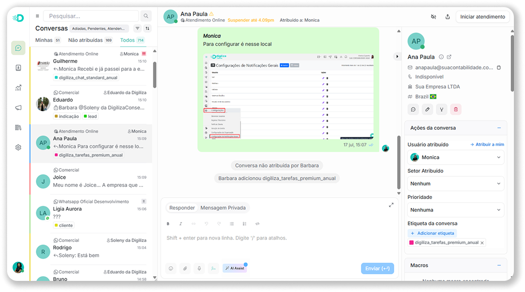 conversas de múltiplos canais, automatizando respostas, integrando com ferramentas de gestão e