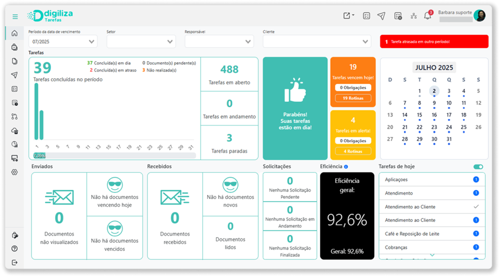 Com a geração automática de tarefas, alertas inteligentes e recorrências programadas, a Digiliza® garante que nenhuma entrega seja esquecida. O contador visualiza tudo em um só painel e mantém o controle total dos prazos, evitando multas e imprevistos.